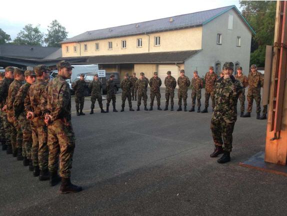 30 Offiziersaspiranten und drei Betreuer, einer davon Oberst Marco Vanoli, der Schulkdt der Genie Offiziersschule, trafen am Freitag, 22.05.2015 bereits um 05:40 von Bremgarten her kommend mit drei Bucher Duro im Zeughaus ein. Kaffee und Gipfel waren schon bereit. Nach einer kurzen